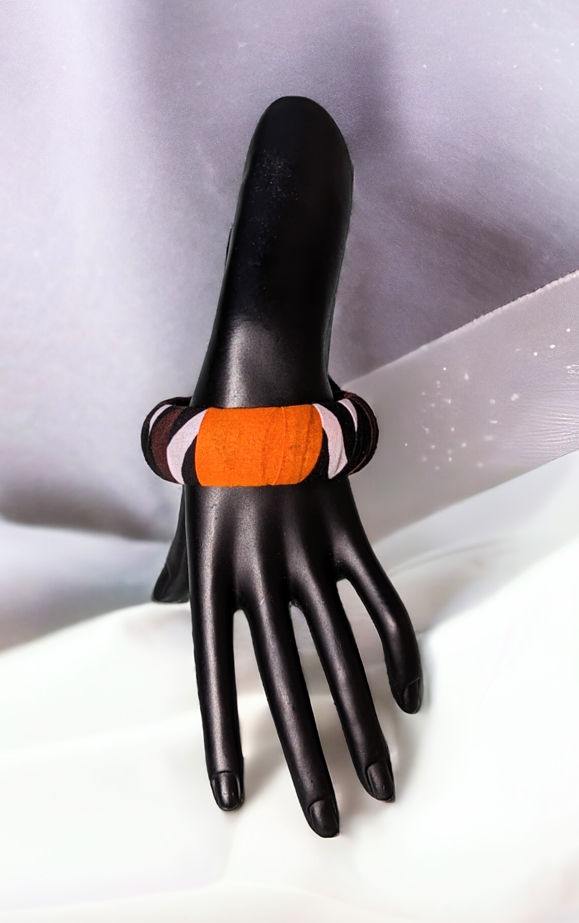 Ce magnifique bracelet artisanal, en bois revêtu du vif tissu wax aux teintes orange, blanc, marron et noir, présente un diamètre de 70 mm.