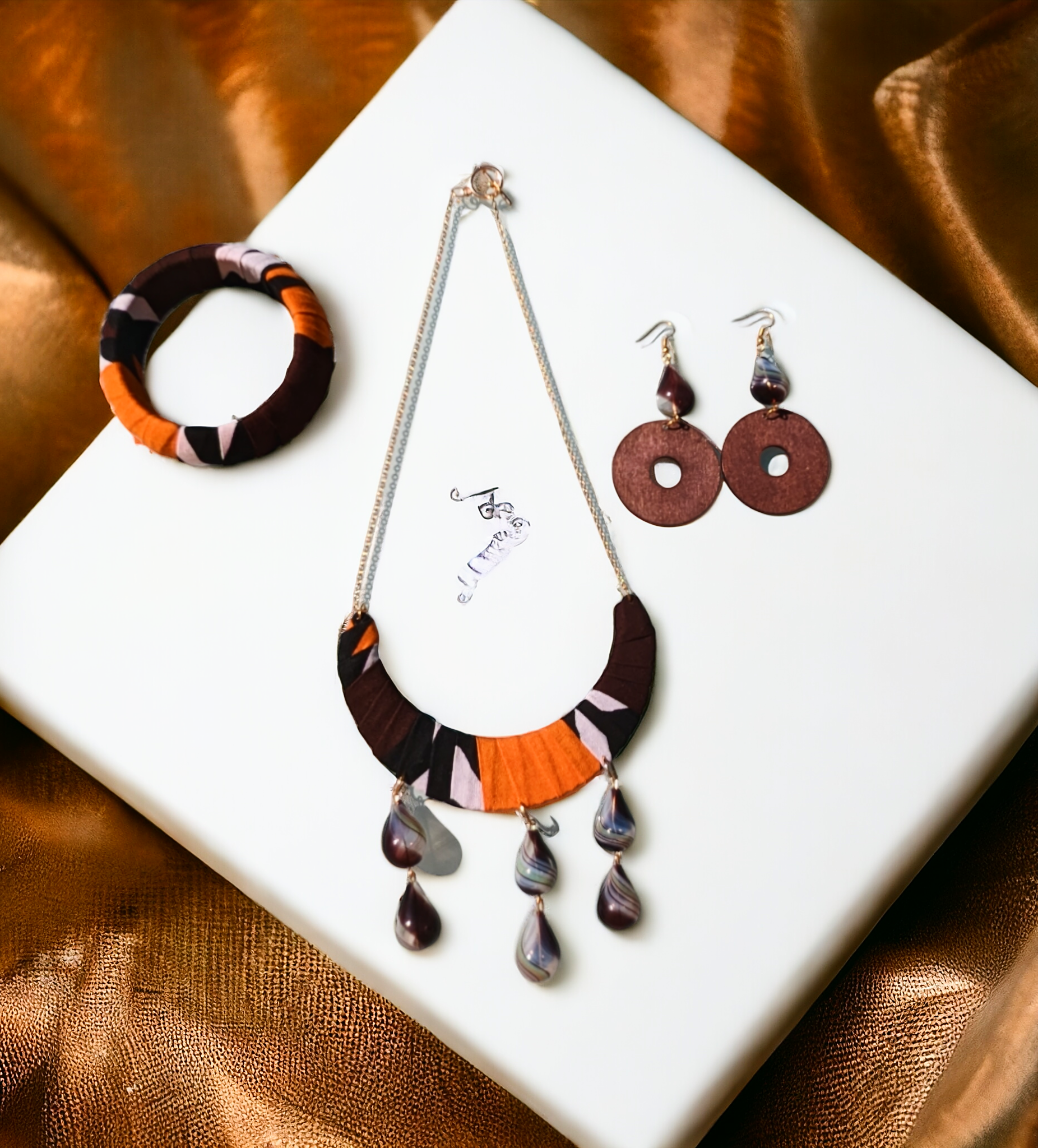 Ce superbe collier en métal, drapé de tissu aux couleurs éclatantes d'orange, marron, noir et blanc, s'étend sur une longueur de 50 cm. Agrémenté d'un pendentif en perles de verre soufflé transparentes faites à la main, il incarne l'élégance artisanale. Livré avec soin dans une pochette artisanale, ce collier devient un bijou distinctif et raffiné.
