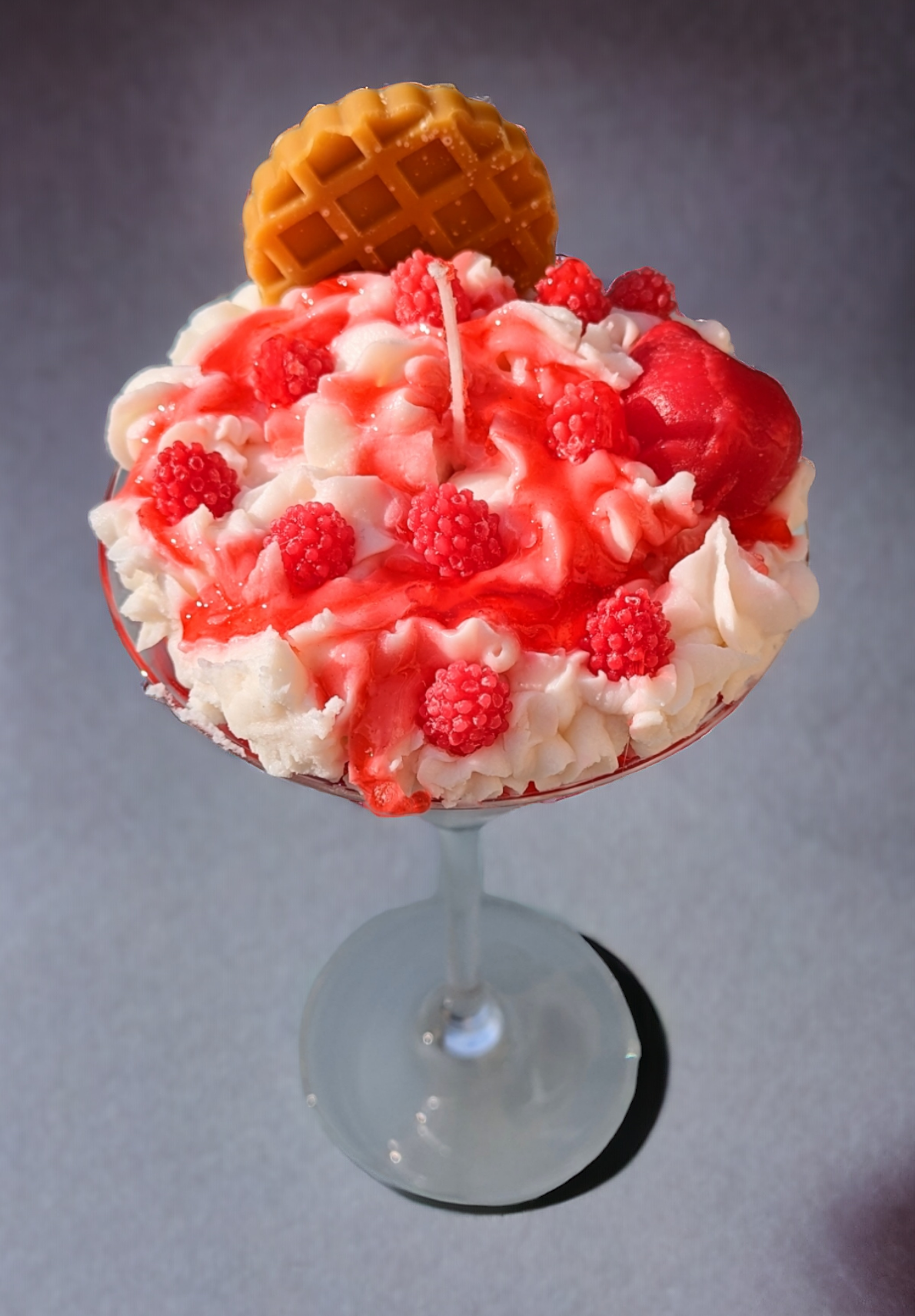 Conçue à base de cire de SOJA, cette bougie assure une combustion propre et écologique. Le coulis, réalisé en cire GEL, ajoute une touche réaliste et appétissante. Dotée d'une mèche en coton, cette bougie mesure 12 cm de long et 18 cm de haut, idéale pour créer une atmosphère chaleureuse et gourmande dans n'importe quelle pièce.