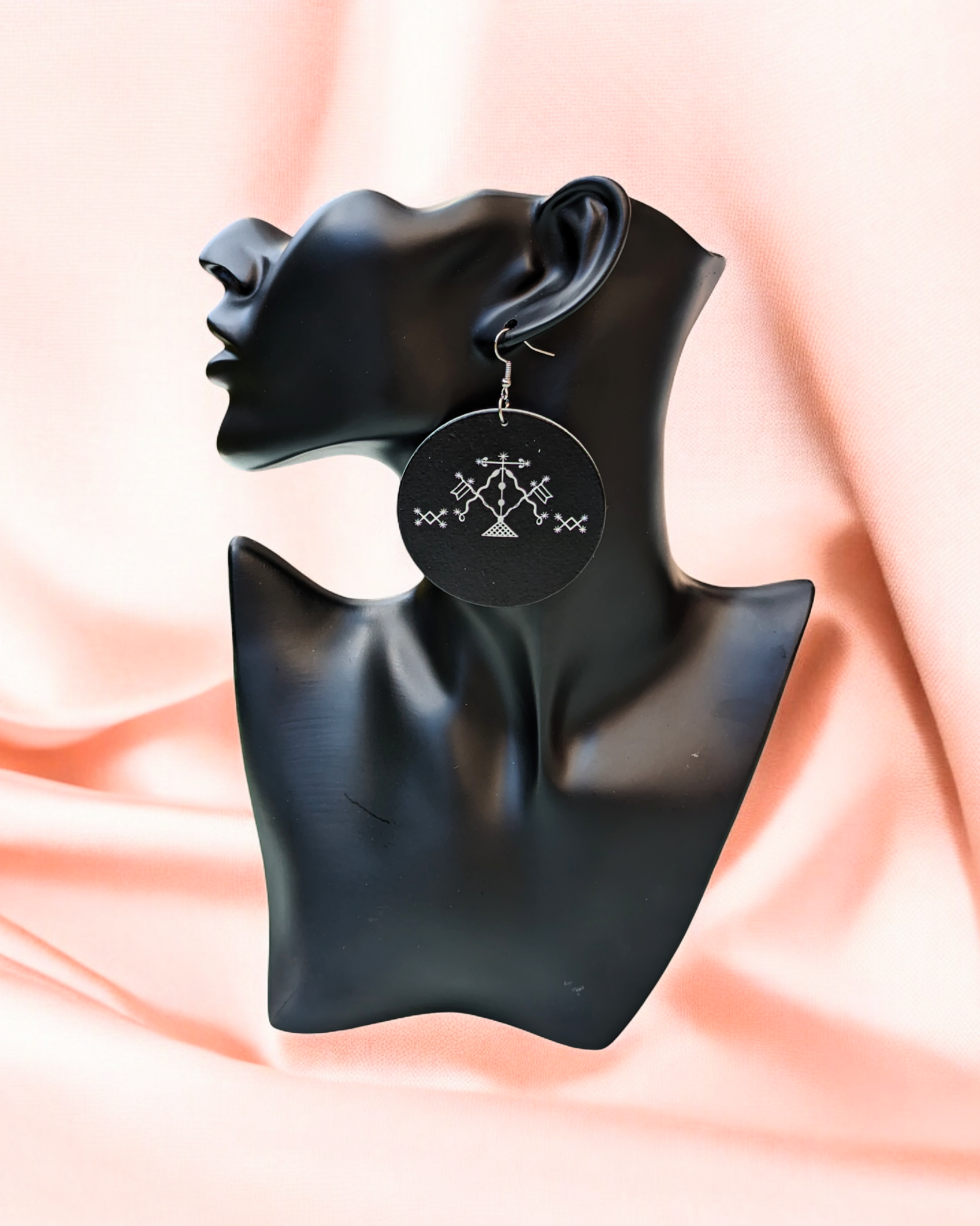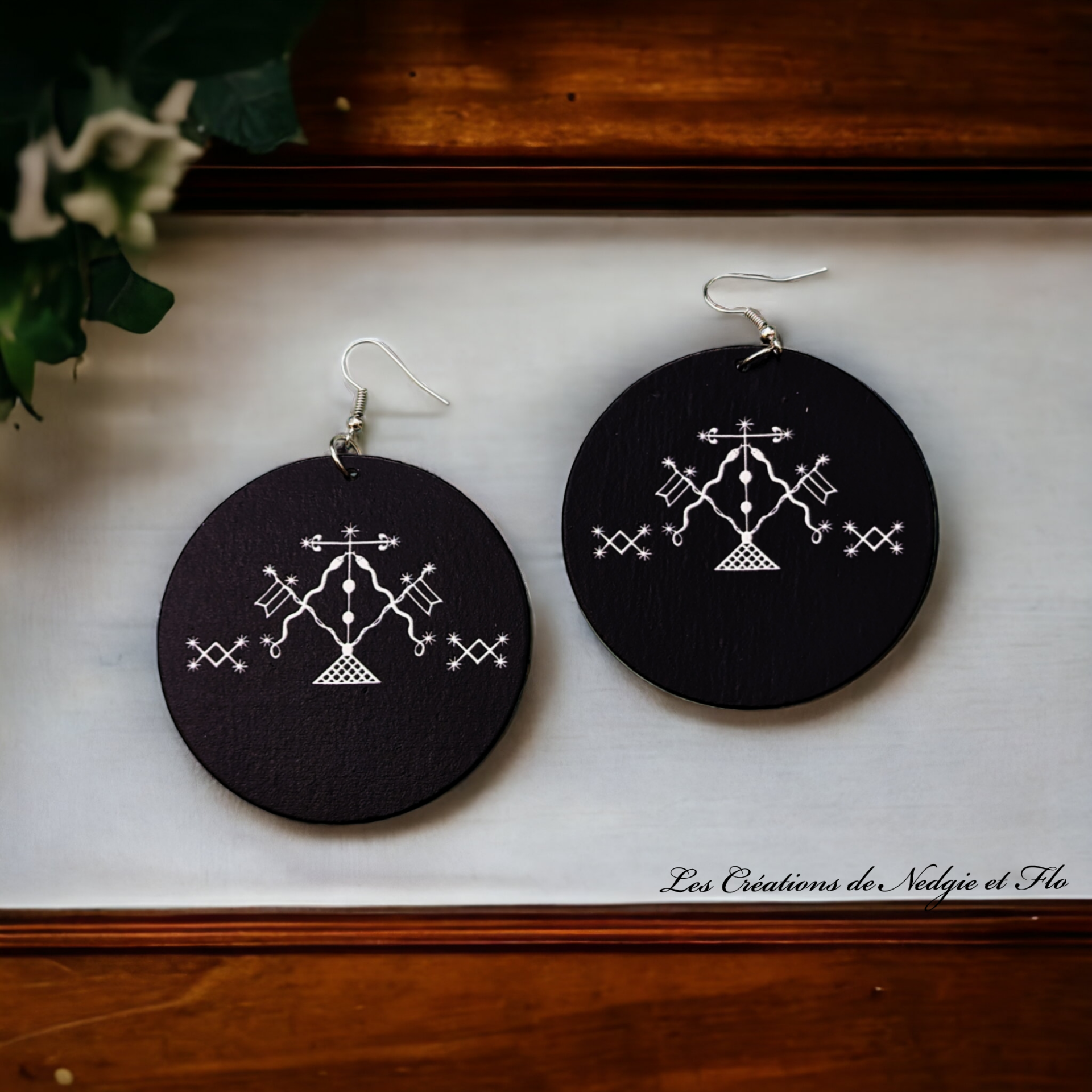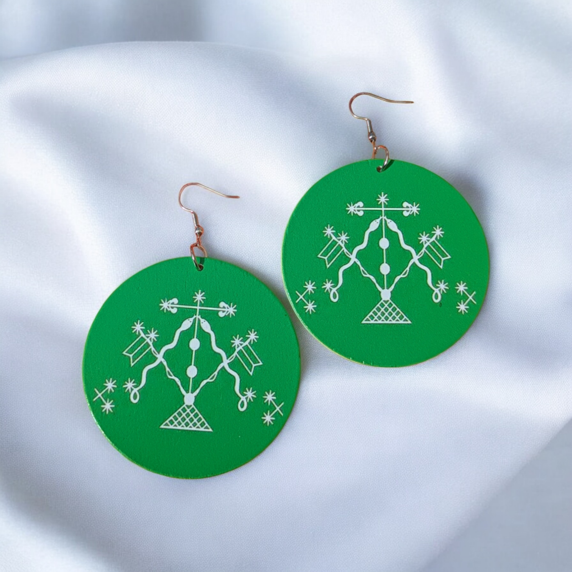 Découvrez cette splendide paire de boucles d'oreilles vertes de 6 cm de diamètre, ornée du vèvè Damballah, symbole de sagesse et de pureté dans la tradition vaudou.